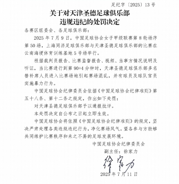 对天津圣德俱乐部通报批评。