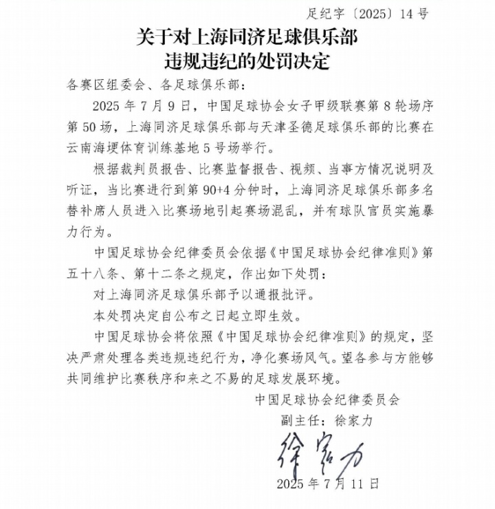 对上海同济俱乐部通报批评。