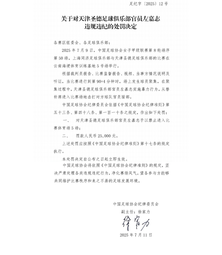 对天津圣德官员左嘉志予以禁止进入比赛体育场5场 ,罚款人民币25000元。