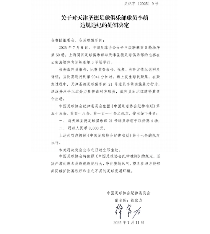 对天津圣德球员李萌停赛4场,罚款人民币8000元。