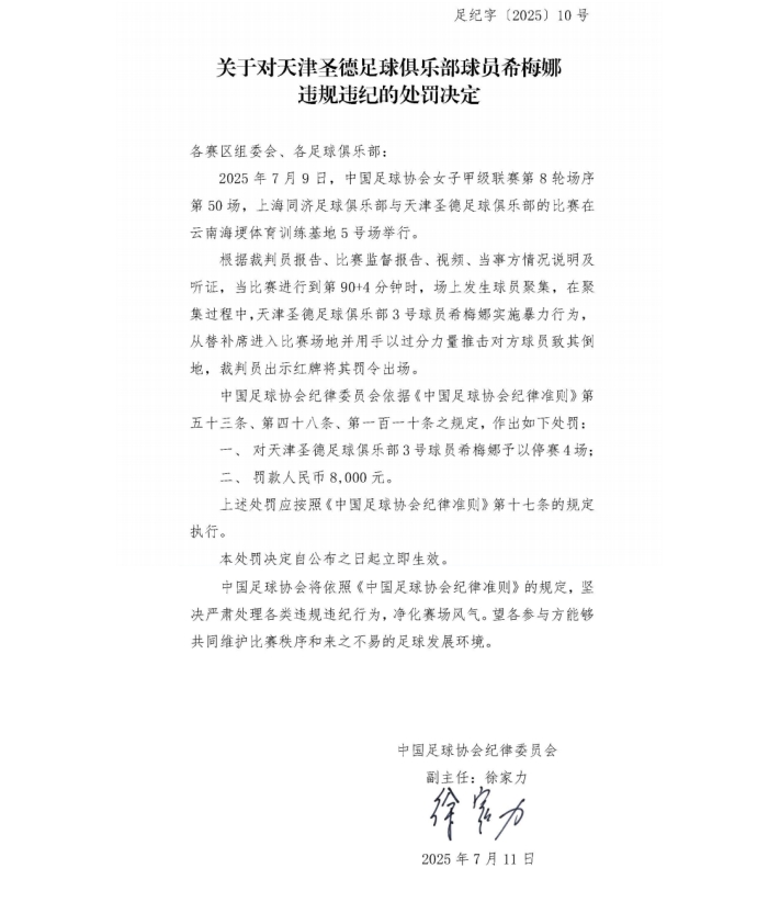 对天津圣德球员希梅娜停赛4场,罚款人民币8000元。