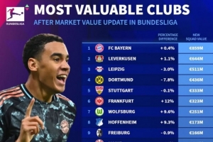 德转德甲球队身价榜:拜仁8.59亿欧居首,药厂莱比锡二三位